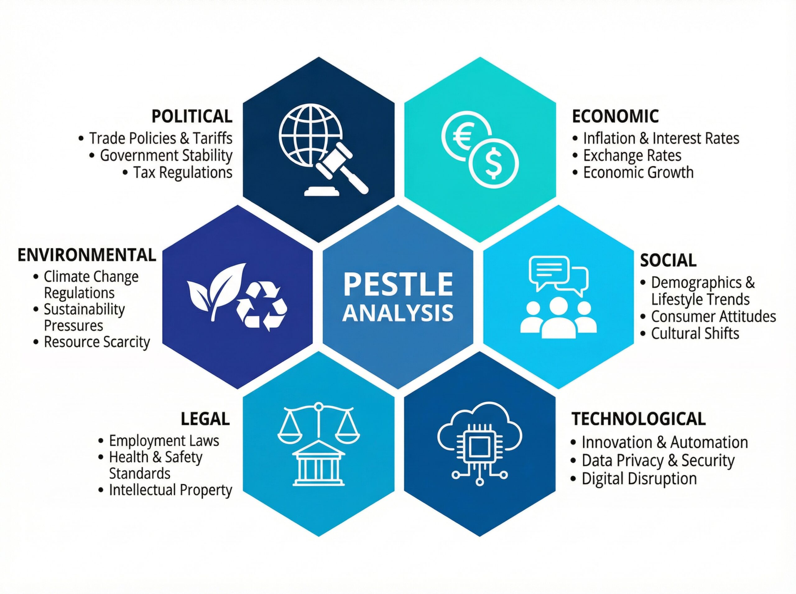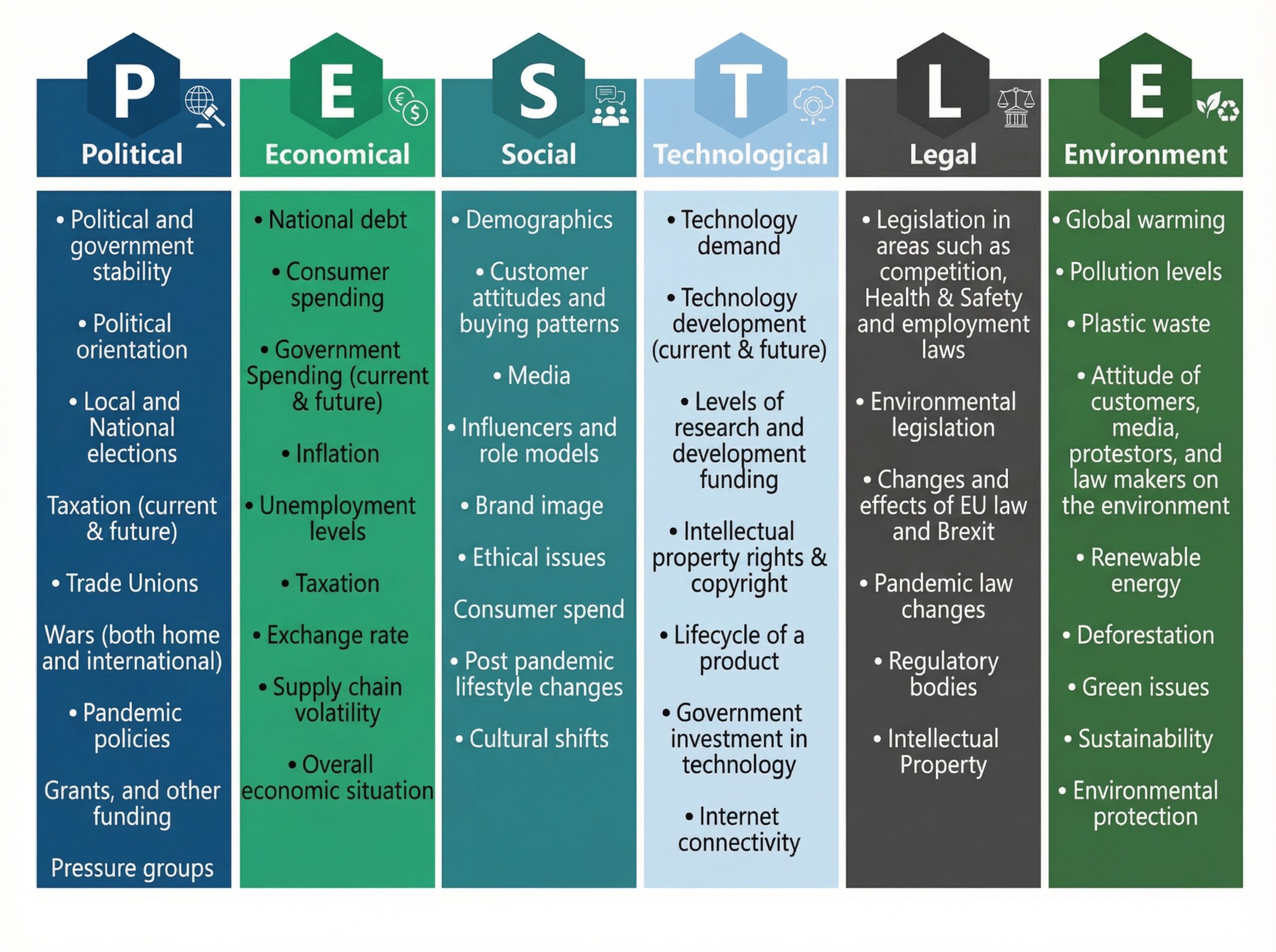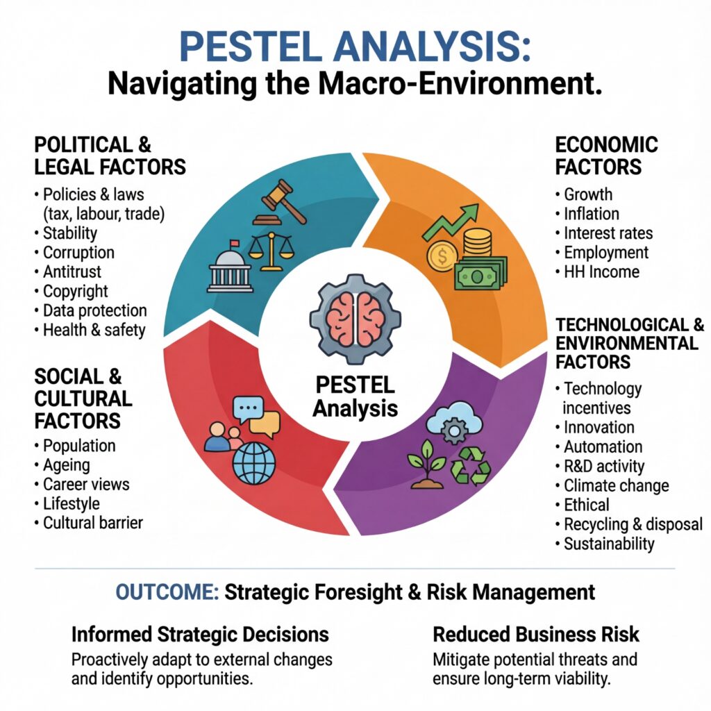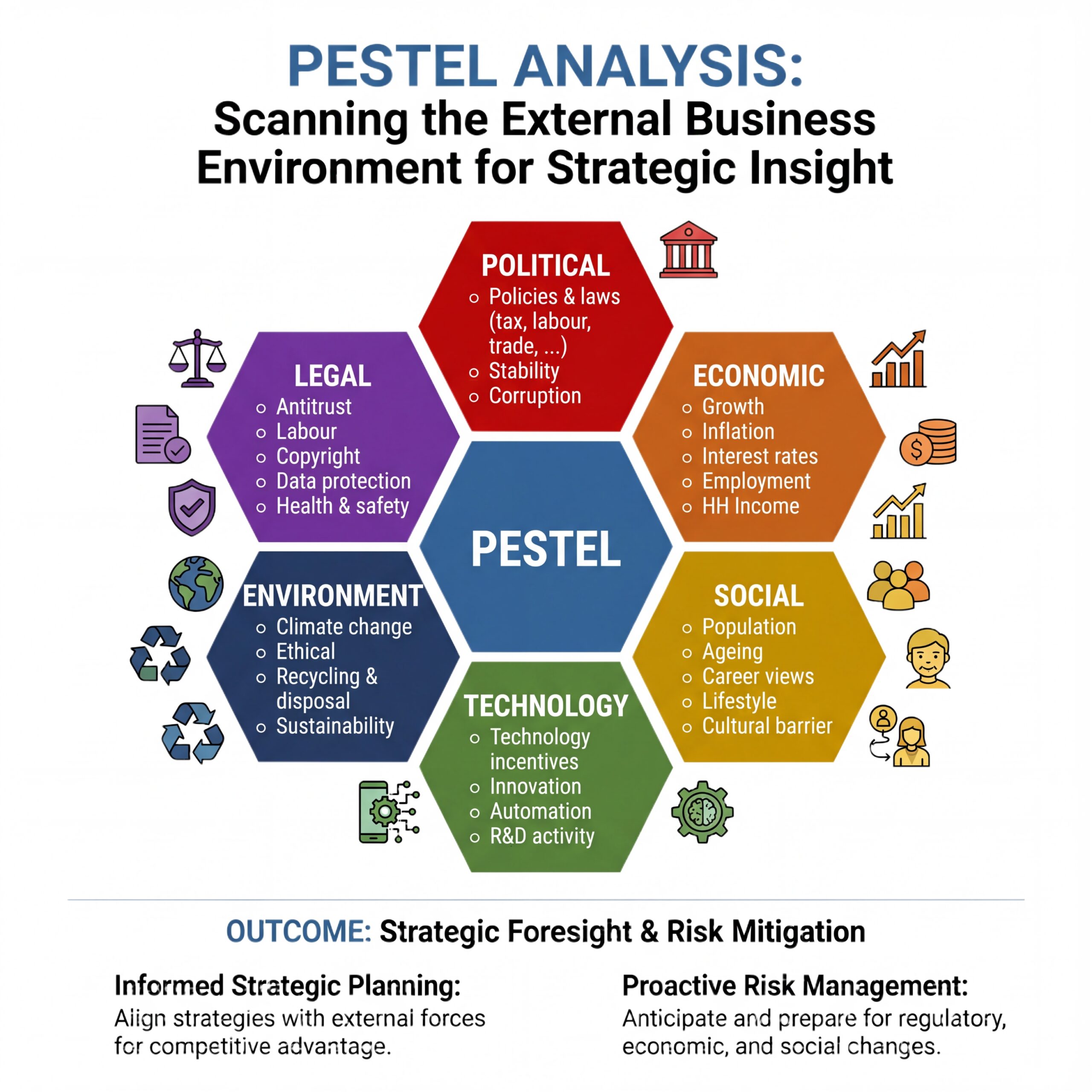 A PESTEL Analysis is a macro-environmental scanning framework used to evaluate the external factors that can impact an organizationβs strategy, performance, and market positioning. It examines: