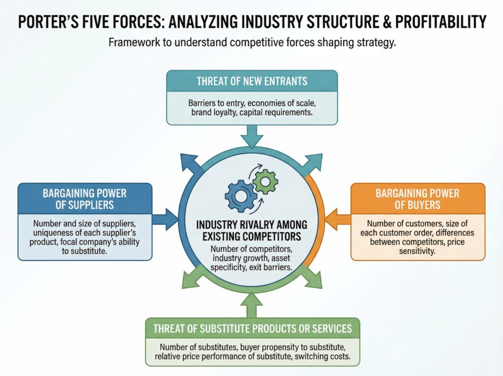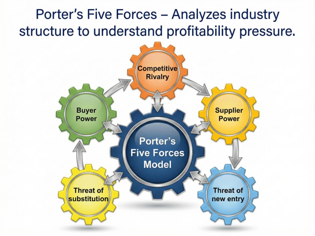 Porter’s Five Forces is an industry structure analysis framework used to understand competitive pressure and long-term profitability.