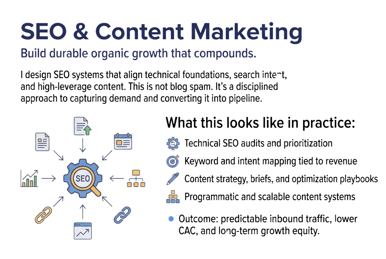I design SEO systems that align technical foundations, search intent, and high-leverage content. This is not blog spam. Itβs a disciplined approach to capturing demand and converting it into pipeline.